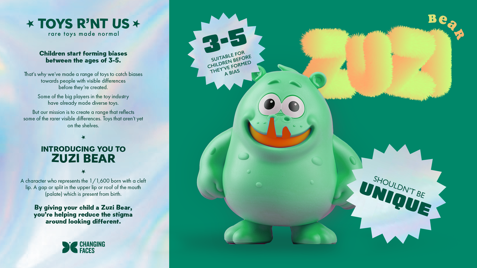 4 in 10 people with a visible difference say their appearance affects how well they did at school. Bullying, lack of concentration, and anxiety are just a few problems they have to deal with. So to tackle the route of these issues and catch the biases before they’re created, we created a rare, special edition toy range with scars, marks and conditions to normalise visible differences from a young age. Children between the ages of 3-5 years to be exact, as that’s when they start forming complex social categories and may show biases based on gender, race, or other visible characteristics.